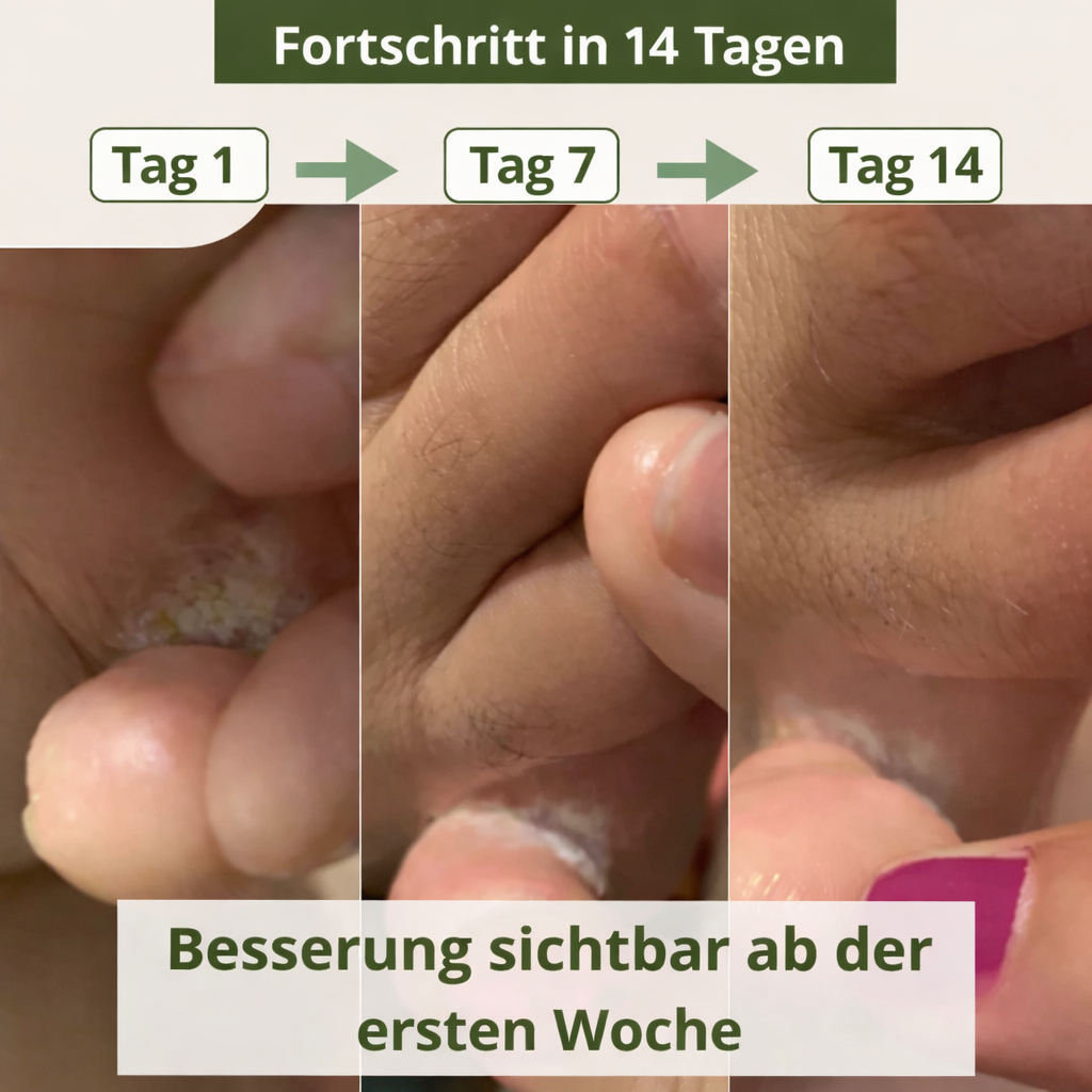 Mit der Zeit wird die Haut sichtbar gesünder, die Anzeichen der Pilzinfektion lassen allmählich nach und das Hautgefühl verbessert sich von Tag zu Tag.